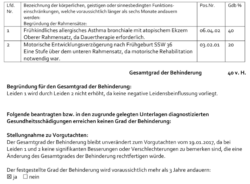 Insgesamt wurde KindA ein Gesamtgrad der Behinderung von 40% bescheinigt und diese Einschätzung damit begründet, dass Leiden 1 durch Leiden 2 nicht erhöht werde, da keine negative Leidensbeeinflussung vorliege.