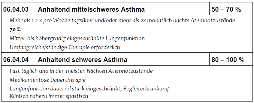In der Anlage zur Einschätzungsverordnung ist sind unter "06 Atmungssystem" folgende Richtsätze für die Erkrankung Asthma Bronchiale" festgelegt:
