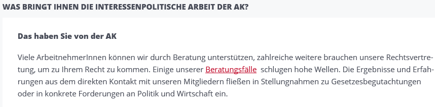 Abschließend wurde der Bf. zwecks Wahrung seiner Interessen daran erinnert, dass in Österreich ein kooperatives Verhältnis der Arbeitgeber- und Arbeitnehmerverbände mit dem Ziel, Interessengegensätze durch Konsenspolitik zu lösen und offene Konflikte einzudämmen, bestehe. Von den Sozialpartnern, die jeweils die Interessen verschiedener Personengruppen vertreten, seien es die Arbeiterkammer und der ÖGB, die die Interessen der Arbeitnehmer in Österreich vertreten würden. Die gesetzliche Interessensvertretung der Arbeitgeber sei die Wirtschaftskammer Österreich. Was die Leistungen der Arbeiterkammer anbelangt, berät diese Kammer ihre Mitglieder in vielen Belangen konkret (siehe nachfolgende Ablichtung eines Teils aus der Website https://www.arbeiterkammer.at/ueberuns/leistungen/index.html ).