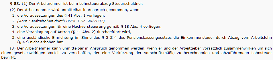 Nach dem durch das Betrugsbekämpfungsgesetz 2010 (BGBl I 105) eingefügten § 83 Abs. 3 EStG 1988 kann ab 1.1.2011 der Arbeitnehmer auch bei vorsätzlichen Zusammenwirken mit dem Arbeitgeber in Betrugsfällen unmittelbar in Anspruch genommen werden. Bloße Fahrlässigkeit schließt die Inanspruchnahme daher aus. Primär ist der Arbeitgeber zur Haftung heranzuziehen, die Inanspruchnahme des Arbeitnehmers darf nur subsidiär erfolgen. Sind aber nachweislich Schwarzlohnzahlungen an den Arbeitnehmer geflossen, der Arbeitgeber jedoch mittlerweile insolvent oder nicht greifbar, geht ein Haftungsbescheid an diesen ins Leere. Diesfalls kann (Ermessen) somit eine unmittelbare Inanspruchnahme des Arbeitnehmers erfolgen.