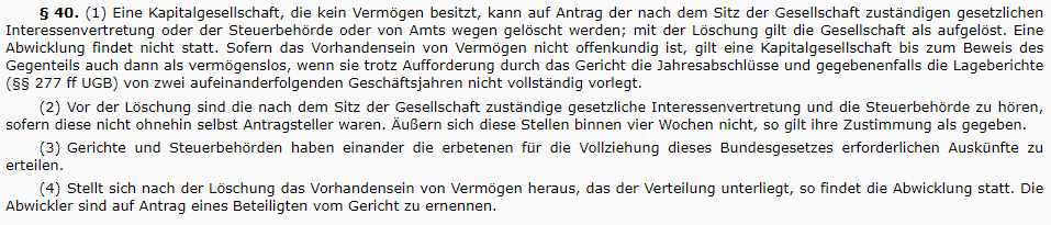 § 40 FBG (Firmenbuchgesetz) in der Fassung des BGBl. I Nr. 120/2005 lautet wie folgt: