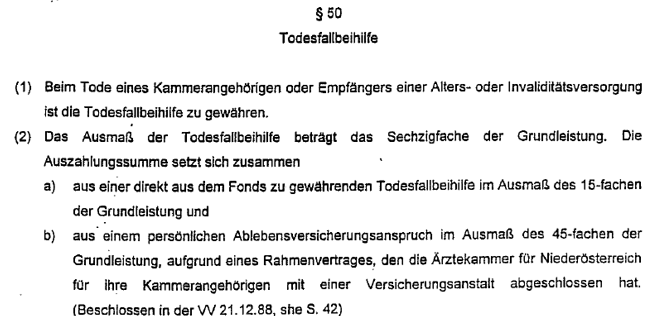 Sowohl die Bestattungsbeihilfe von 4.000,00 € als auch die Hinterbliebenenunterstützung von 34.066,03 € (zusammengesetzt aus Teilbeträgen von 5.516,51 € und von 28.549,52) wurden als einmalige Leistungen satzungsgemäß vom Wohlfahrtsfonds der Ärztekammer Niederösterreich an den Bf gezahlt. Der Wohlfahrtsfonds bildet ein zweckgebundenes Sondervermögen der Ärztekammer (§ 96 Abs. 1 ÄrzteG 1998) und kann unter anderem eine Bestattungsbeihilfe und eine Hinterbliebenenunterstützung gewähren (§ 98 Abs. 1a ÄrzteG 1998). Letztere sind in § 104 ÄrzteG 1998 gesetzlich geregelt, diese gesetzliche Vorgabe wurde in den §§ 37, 38 der Satzung des Wohlfahrtsfonds der Ärztekammer Niederösterreich umgesetzt.