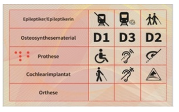 Der Behindertenausweis im Scheckkartenformat ist ein Ausweis, der auf der Vorderseite der Scheckkarte u.a. die persönlichen Daten des Inhabers bzw. der Inhaberin, das Datum der Ausstellung sowie den Grad der Behinderung enthält. Der ebenfalls auf der Vorderseite angebrachte QR-Code ermöglicht Menschen mit Behinderung, auf der Homepage des Sozialministeriumservice nähere Informationen zum Behindertenpass und den einzelnen Zusatzeintragungen abzurufen. Auf der Rückseite der Scheckkarte werden vorliegende Zusatzeintragungen größtenteils in Form von Piktogrammen vorgenommen. Das vorliegende Schaubild zeigt die vorgesehenen, mit Vertretern der Behindertenorganisationen abgestimmten Piktogramme: