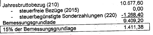 Mit dem Einkommensteuerbescheid für das Jahr 2014 wurde der Gesamtbetrag der Einkünfte aus nichtselbständiger Arbeit für das Jahr 2014 nach Abzug des Berufsgruppenpauschale in Höhe von 576,19 € gemäß § 17 EStG 1988 von der Summe der (von den bezugsauszahlenden Stellen dem Finanzamt mittels Lohnzettel angezeigten) steuerpflichtigen Bezüge (245) in Höhe von 17.134,25 € festgesetzt. Aus der nachfolgenden Ablichtung sind die steuerpflichtigen Bezüge des Lohnzettels der Eigentümergemeinschaft für das Jahr 2014 ersichtlich: