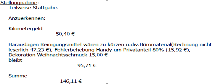 Im gegenständlichen Rechtsmittelverfahren war der Beschwerde teilweise Folge zu geben, weil von den als Werbungskosten geltend gemachten finanziellen Belastungen das Kilometergeld in Höhe von 50,40 € und diverse Barauslagen in Höhe von 95,71 € als gemäß § 16 EStG 1988 abzugsfähige Werbungskosten anzuerkennen waren.