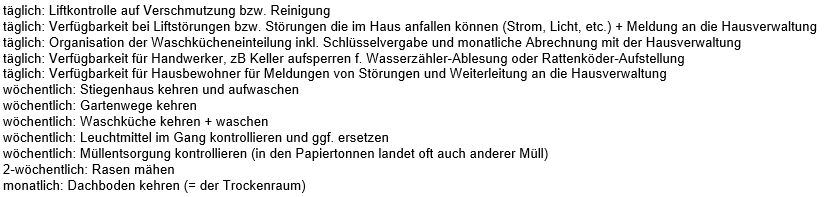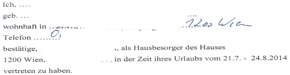 Aus der nachfolgenden Ablichtung ist die Aufzählung der notwendigen Arbeiten während der Urlaubsvertretung im Sommer 2014 ersichtlich: Mit der Mail vom 30.10.2020 wurde eine vom Ehegatten der Bf. unterschriebene Bestätigung über die Urlaubsvertretung für das Jahr 2014 vom 28.08.2014 und die - nachfolgend abgelichtete- (gekürzte) E-Mail der Hausverwaltung an die steuerliche Vertreterin der Bf. aus dem Jahr 2016 (20.08.2016), "wo eine allgemeinere Darstellung der Hausverwaltung aufgelistet ist", übermittelt: