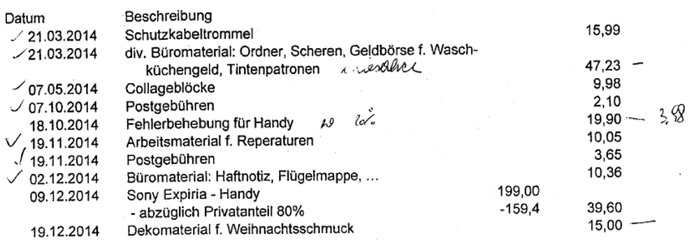 Zwischen den Verfahrensparteien stehen das Kilometergeld in Höhe von 50,40 € und diverse Barauslagen in Höhe von 95,71 € jeweils als Werbungskosten gemäß § 16 EStG 1988 außer Streit. Der abgabenrechtliche Charakter dieser Ausgaben in der Gesamthöhe von 146,11 € war anhand der Beilagen zum Ergänzungsschreiben des Bf. zum Vorlageantrag vom 15.04.2016, bestehend aus dem Fahrtenbuch 2014 mit Ausweis von Kosten von 50,44 € für 120 Dienstkilometer und der nachfolgend abgelichteten Aufgliederung von Materialkosten mit Auszeichnung jener Ausgaben, denen die belangte Behörde nach abgabenbehördlicher Überprüfung der Kostenbelege Werbungskostencharakter im Sinn des § 16 EStG 1988 bescheinigt hatte, festzustellen:
