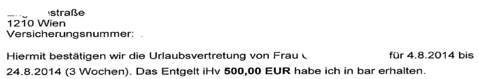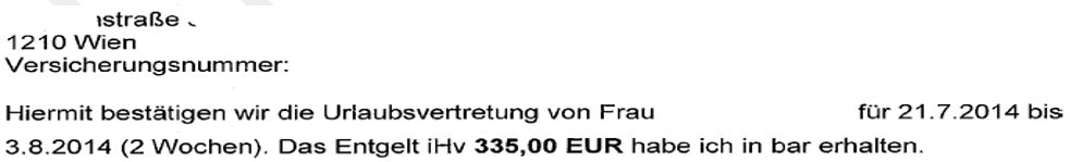 Mit dem Begleitschreiben vom 31.08.2016 zu den nachfolgend abgelichteten Bestätigungen über Zahlungen an den Ehegatten und den Sohn im Rahmen der Urlaubsvertretung im Jahr 2014 hat die Bf. die Amtsvertretung darüber in Kenntnis gesetzt, dass das Geld für den Ehegatten und den Sohn der Bf. innerhalb der Familie in bar ausgezahlt worden war: