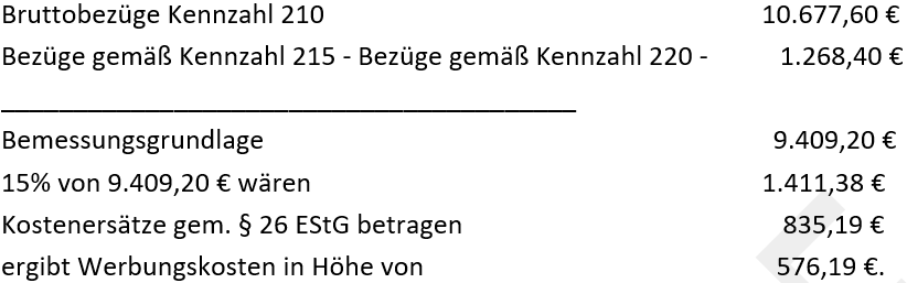 Mit der Beschwerde gegen den zuvor genannten Abgabenbescheid wurde die Abänderung des Bescheides mit einem bei der Berechnung der Kostenpauschale für das Dienstverhältnis bei der Eigentümergemeinschaft unterlaufenen Fehler begründet und die Berücksichtigung der nachfolgenden Berechnung für die Werbungskostenpauschale beantragt: