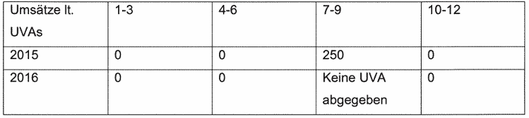 Für den Zeitraum 2017 seien Umsatzsteuervoranmeldungen mit folgenden Umsätzen abgegeben worden: