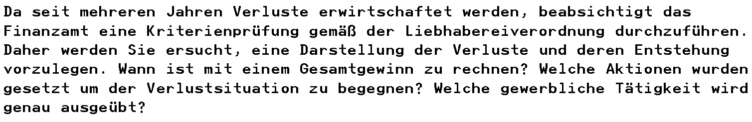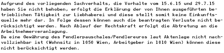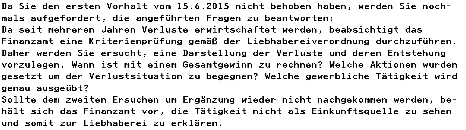 Der Bescheid war Folge der Nichtbeantwortung der Vorhalte des Finanzamts vom 15.06.2015 und 29.07.2015, mit denen die Bf. um Ergänzung der Abgabenerklärung 2014 ersucht wurde. Der Vorhalt vom 15.06.2015 mit Ende der Frist am 22.07.2015 stand in Zusammenhang mit der abgabenbehördlichen Wertung der gewerbebetrieblichen Einkünfte als Liebhaberei und beinhaltete daher folgenden Text: