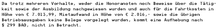 Der Abgabenbescheid 2014 in Form der Beschwerdevorentscheidung gemäß § 262 BAO vom 27.06.2016 sprach zwar aufgrund dessen Spruchs - Abänderung des Bescheids vom 15.02.2016 aufgrund der Beschwerde vom 29.02.2016 - für den Willen der Amtsvertretung, dem Antrag der Bf. gemäß § 299 Abs. 1 BAO stattzugeben, jedoch ist dieser Bescheid in Form der vorläufigen Festsetzung der Einkommensteuer 2014 kein Bescheid, mit dem das Finanzamt über die Beschwerde gegen den Abweisungsbescheid vom 15.02.2016 abgesprochen hat. Zum Beweis dafür sei auf das elektronische EDV-Datenprogramm verwiesen, welches die Erlassung eines NEUEN Sachbescheides erst nach ordnungsgemäßer elektronischer Verarbeitung der Daten eines dem Antrag gemäß § 299 BAO stattgebenden Bescheides zugelassen hätte.