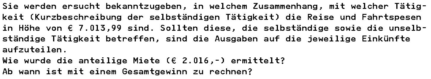 Mit dem auf Ergänzung der Beschwerde gerichteten Vorhalt des Finanzamts vom 17.06.2016 betreffend die abgabenrechtliche Würdigung der dem Finanzamt bislang angezeigten Einkünfte aus Gewerbebetrieb wurde die Bf. um Beantwortung der nachstehenden Fragen samt Beilage der erforderlichen Unterlagen zum Nachweis der Richtigkeit der Angaben der Bf. bis zum 22.07.2016 ersucht: