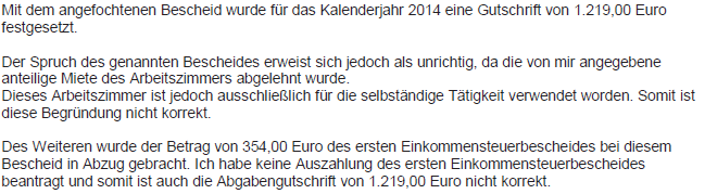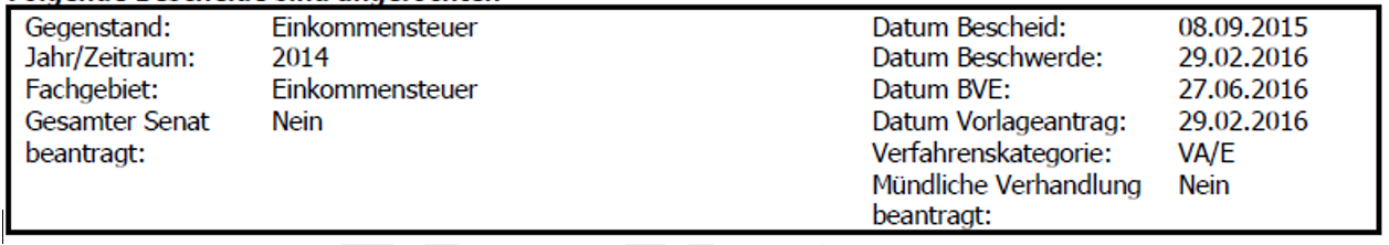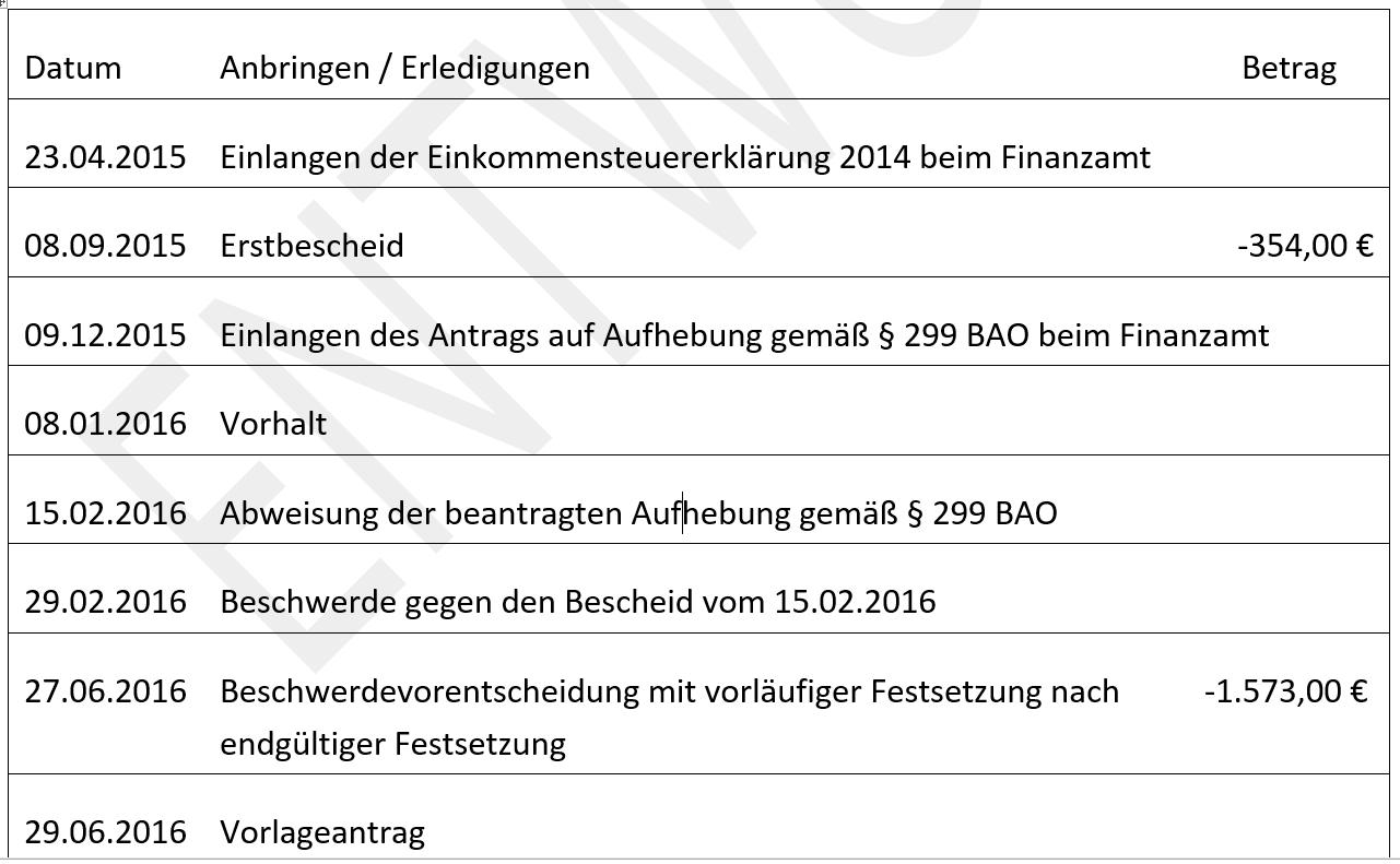 Mit dem Vorlageantrag zum "Einkommensteuerbescheid 2014 vom 27.06.2016" samt "Antrag auf Aufhebung gemäß § 299 Abs. 1 BAO" wurde die Aufhebung des zuvor genannten Bescheides vom 27.06.2016 und die Erlassung eines neuen Bescheides, in dem die nachangeführten Punkte berücksichtigt werden, beantragt: