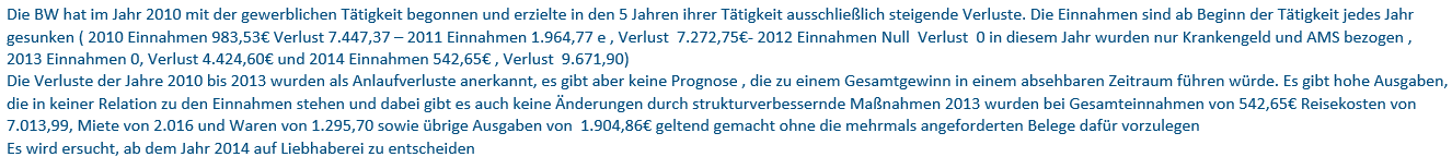 Abschließend sprach sich die Bf. dafür aus, alles, wie schon im Schreiben des BFG angeführt, als Liebhaberei zu betrachten und den Akt zu schließen. Im Übrigen gab die Bf. an, froh zu sein, dass sie sich aus dieser misslichen Lage wieder herausarbeiten habe können, und hielt abschließend fest, "damit nichts mehr zu tun haben" zu wollen.