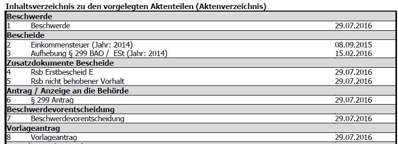 Die mit dem Vorlageantrag angefochtene Beschwerdevorentscheidung lässt zwar mit der vorläufigen Festsetzung der Einkommensteuer 2014 in Höhe von nunmehr -1.573,00 € den Rückschluss auf den abgabenbehördlichen Willen, dem Antrag der Bf. gemäß § 299 BAO stattzugeben, zu, vermag allerdings nicht einen Bescheid, mit dem einem Antrag gemäß § 299 BAO durch das Finanzamt im Rechtsmittelverfahren stattgegeben wird, zu ersetzen. Ob ein solcher Bescheid erlassen worden ist, ist ungewiss. Zum Beweis für diese Ungewissheit sei auf die nachfolgende Ablichtung des Inhaltsverzeichnisses zu den vorgelegten Aktenteilen im Vorlagebericht der belangten Behörde verwiesen, welche die Nichtvorlage eines dem Antrag der Bf. gemäß § 299 BAO stattgebenden abgabenbehördlichen Bescheides zur Entscheidung über den Vorlageantrag vom 29.06.2016 betreffend die Beschwerdevorentscheidung vom 27.06.2016 durch das BFG bestätigt: