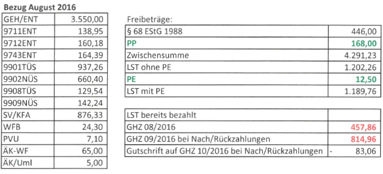Die Berechnung für den Auszahlungsmonat 08/2016 (Beilage 1) beinhaltet keine Berücksichtigung von Pendlerpauschale und dem Pendlereuro. Eine Neuberechnung der Lohnsteuer unter Berücksichtigung von Pendlerpauschale und Pendlereuro ergibt eine solche von € 1.189,76 (s.u.). Vergleicht man diese mit der geleisteten Lohnsteuer für 8/2016 auf dem GHZ 08/2016 i.H.v. € 457,86 und auf dem GHZ 09/2016 bei "Nach/Rückzahlungen" i.H.v. € 814,96 (Summe € 1.272,82) ergibt sich daraus eine Gutschrift für dieses Monat i.H.v. € 83,06 (s.u.).
