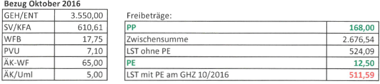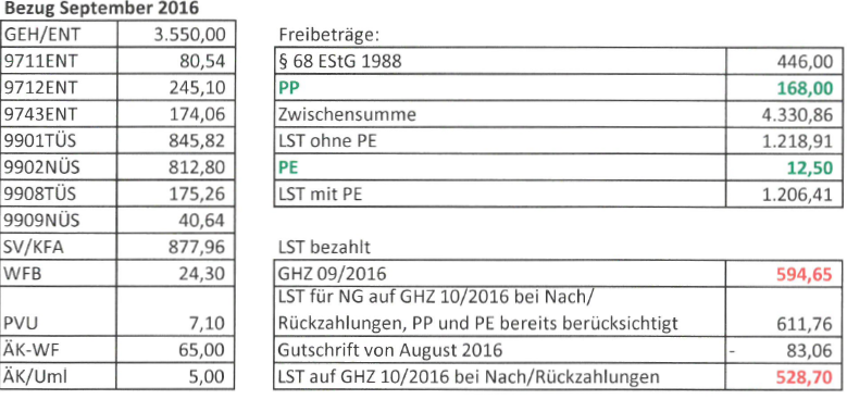 Eine Neuberechnung der Lohnsteuer unter Berücksichtigung von Pendlerpauschale und Pendlereuro für 9/2016 ergibt eine solche von € 1.206,41 (s.u.). Die geleistete Lohnsteuer für 9/2016 auf dem GHZ 09/2016 (Beilage 2) ist i.H.v. € 594,65 ausgewiesen. Auf dem GHZ 10/2016 (Beilage 3) ist an Lohnsteuer für Nebengebühren bei "Nach/Rückzahlungen ab 08/2016" bei berücksichtigter Pendlerpauschale und Pendlereuro € 528,70 ausgewiesen, die sich aus Lohnsteuer für Nebengebühren bei Nach/Rückzahlungen ab 08/2016 bei berücksichtigter Pendlerpauschale und Pendlereuro i.H.v. 611,76 abzüglich der oben errechneten Gutschrift für 08/2016 i.H.v. € 83,06 ergibt.