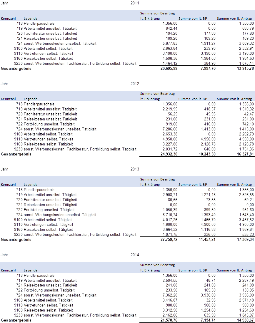Einkünfte aus selbständiger Arbeit (320) unter Berücksichtigung der Änderungen der Kzlen 9100 und 9230 sowie des geänderten Gewinnfreibetrages, die Kz 9160 bleibt unverändert (für die Jahre 2011,2012 und 2014 erfolgte diesbezüglich kein Änderungsantrag, siehe Excel-Tabelle, für 2013 konnten die über die bereits gewährten Reisekosten hinaus beantragten mangels Nachweises der beruflichen Bedingtheit nicht anerkannt werden)