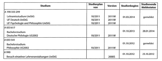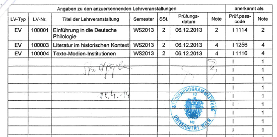 Mit Bescheid der Studienpräses der Universität Wien vom 30.4.2014 wurde dem Antrag von C B vom 29.4.2014 auf Anerkennung von Prüfungen gemäß § 78 Abs 1 UG 2002 (BGBI. I Nr. 120/2002 idgF) iVm dem Studienplan der Studienrichtung Lehramtstudium UF Deutsch erschienen im Mitteilungsblatt der Universität Wien nach UOG 1993, Stück XXXII, Nummer 321, idgF am 26. 6. 2002, im Studienjahr 2001/02 stattgegeben und folgende Leistungen für die dort angegebenen Prüfungen mit Note und Datum anerkannt: