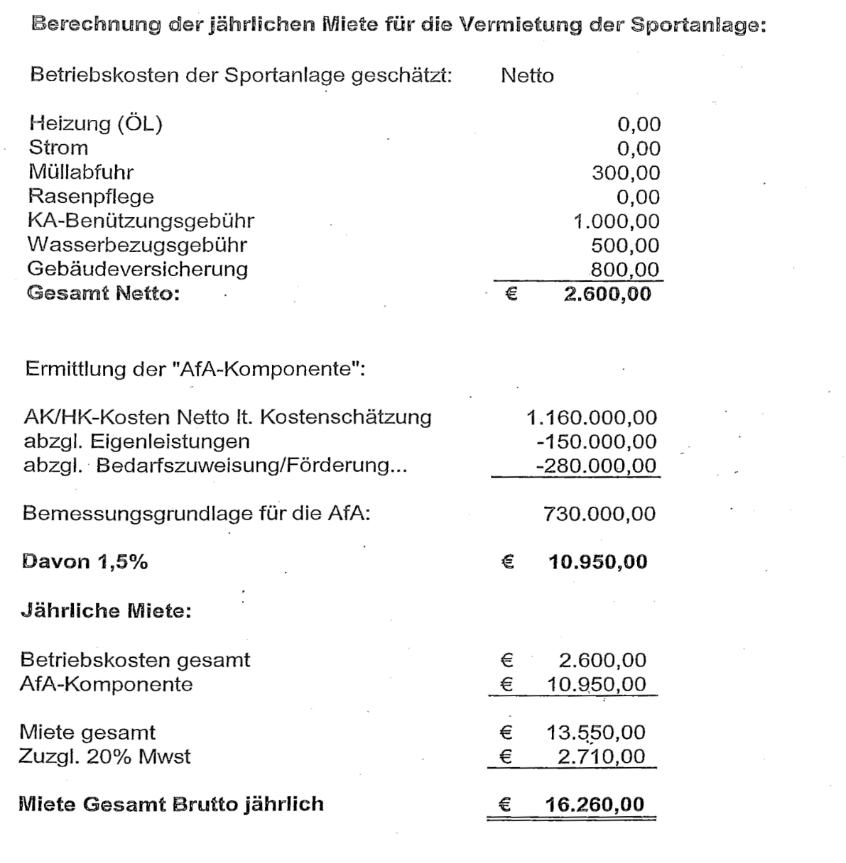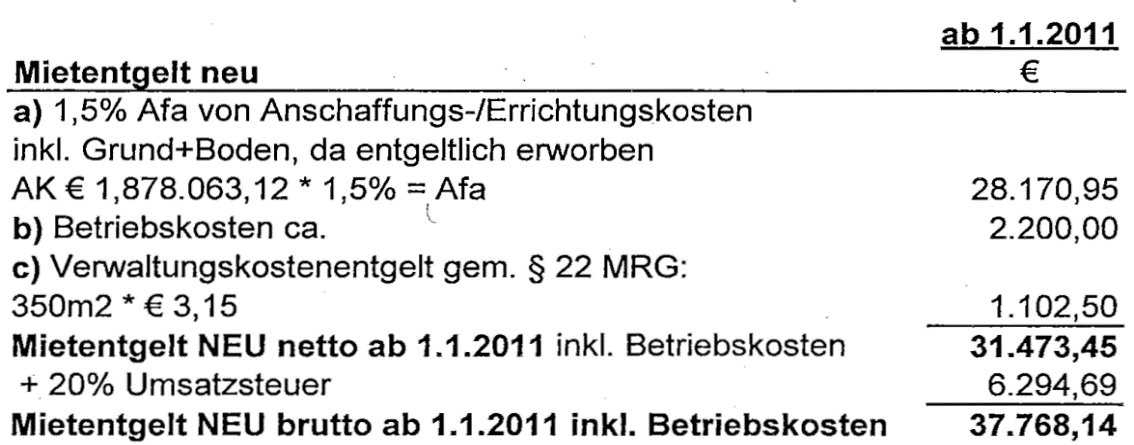 Der Mietzins beträgt € 13.550,00 jährlich zuzüglich 20% USt, somit brutto € 16.260,00.