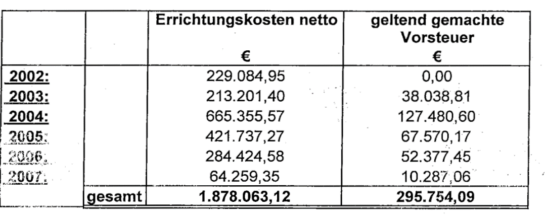 Die aus den Errichtungskosten geltend gemachten Vorsteuern betrugen: