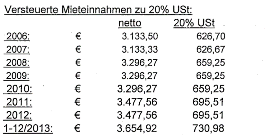 Da Rechnungen mit gesondertem Ausweis der Umsatzsteuer an den Mieter nicht ausgestellt wurden, erfolgte seitens der BP keine Vorschreibung der Umsatzsteuer kraft Rechnungslegung gemäß § 11 Abs. 12 UStG. Die steuerpflichtigen Umsätze zu 20% wurden um € 3.477,56 vermindert.