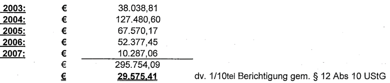 Da in den Jahren 2006 bis 2010 (5 Jahre) nach den Feststellungen der BP eine steuerpflichtige Vermietung gegeben war, wurden im Jahr 2011 nur 5/10tel der oa. geltend gemachten Vorsteuerbeträge, das sind € 147.877,05 rückgeholt.