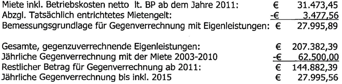 Jedoch könnten bei einer Erhöhung der Miete die Eigenleistungen auch bis zur jeweiligen Miete gegenverrechnet werden. Dann würde eine zwar gänzliche Gegenverrechnung schon vor dem Jahre 2017 eintreten, jedoch sei diesbezüglich kein vertraglicher Widerspruch zum Mietvertrag erkennbar.