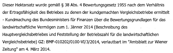 *)Kundmachung des Bundesministers für Finanzen über die Bewertungsgrundlagen für das landwirtschaftliche Vermögen zum 1. Jänner 2014 (Beschreibung des Hauptvergleichsbetriebes und Feststellung der Betriebszahl für die landwirtschaftlichen Vergleichsbetriebe) GZ: BMF-010202/0100-VI/3/2014, verlautbart im "Amtsblatt zur Wiener Zeitung" am 4. März 2014.