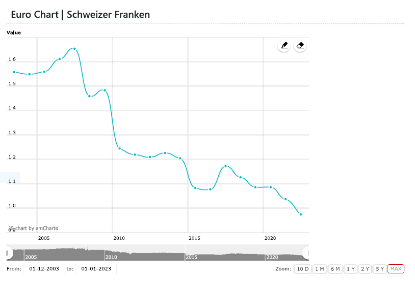 Auch aus der Entwicklung der Kurse des Schweizer Franken lässt sich für 2014 jener Kurs von 1,04 laut steuerlicher Vertretung nicht ableiten. Die Entwicklung des Schweizer Franken ab 2003 bis 2022 stellt sich graphisch wie folgt dar: