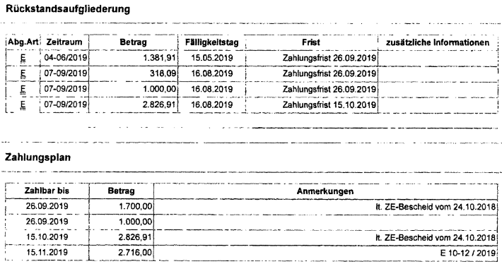Auf der Rückstandsaufgliederung, welche meine steuerliche Vertretung am 14. September 2019 erstellt hat, sind die weiteren Zahlungsfristen mit 26. September 2019 für einen Betrag in Höhe von insgesamt EUR 1.700,00 bzw. 15. Oktober 2019 für den Teilbetrag von EUR 2.826,91 angemerkt.