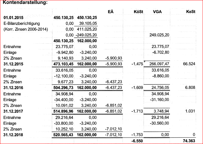 • Zur objektiven Tatseite ist weiters festzuhalten, dass sich das Verrechnungskonto im Prüfungszeitraum lediglich von 450.130 € (per 1.1.2015) auf 520.565 € (zum 31.12.2018), somit um die Differenz in der Höhe von 70.435 € erhöht hat, worauf unter Berücksichtigung der jeweils geltenden KESt-Steuersätze eine KESt von 18.795 € entfallen würde, wie dies auch die Frau Amtsbeauftragte in ihrer Replik vom 22.12.2021 auf die Rechtfertigung meiner Mandanten vom 15.11.2021 richtig berechnet hat.