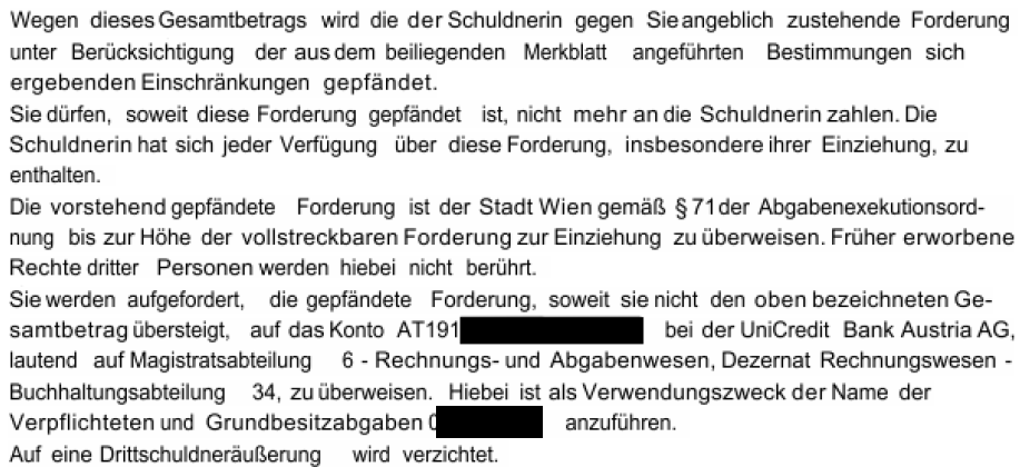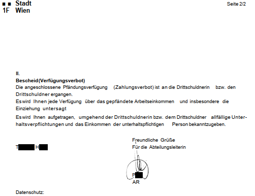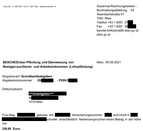 Stattdessen erließ das Dezernat Rechnungswesen den Lohnpfändungsbescheid 09.09.2021, stellte ihn aber nur meinem Dienstgeber zu, sonst niemandem. Der Dienstgeber, die ***Arbeitgeber*** zog € 336,69 vom meinem Gehalt ab, übermittelte erst nach zahlreichen Nachfragen den Lohnpfändungsbescheid 09.09.2021.