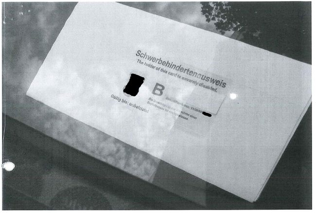 Diesbezüglich wurden auch vom Parkraumüberwachungsorgan Fotos angefertigt, wobei ein Foto den Schwerbehindertenausweis wie folgt zeigt (Foto und Geschäftszahl wurde für die Entscheidung anonymisiert):