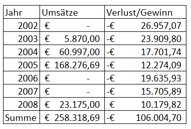 Die Gesellschaft erzielte laut Erklärungen in den angegebenen Jahren folgende Umsätze bzw. erwirtschaftete folgende Verluste bzw. Gewinne: