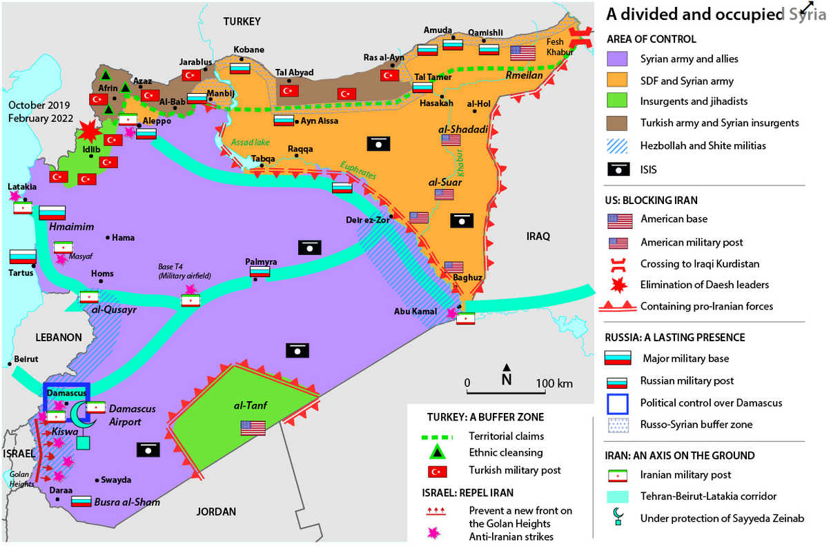 Die folgende Karte zeigt die verschiedenen internationalen Akteure und deren militärische Interessenschwerpunkte in Syrien: