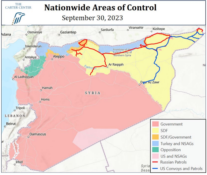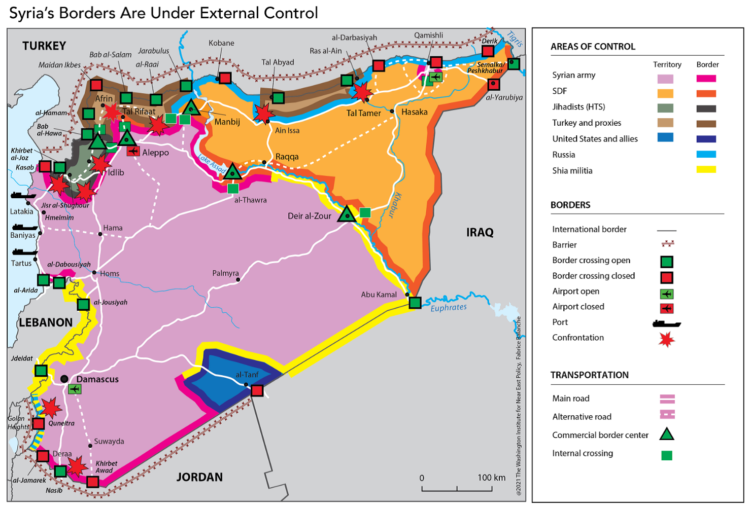 Über zehn Jahre nach Konfliktbeginn hat das syrische Regime die Souveränität über seine Grenzen nicht vollständig wiedererlangt. Neben jenen Gebieten im Norden des Landes an der Grenze zur Türkei und dem Irak, die sich weitgehend oder ganz der Kontrolle des Regimes entziehen, sind in den Gebieten unter Regierungskontrolle gemeinsam mit den syrischen staatlichen Sicherheitskräften auch nicht-staatliche und ausländische Akteure entlang der internationalen Grenzen aktiv. In diesem Zusammenhang sind insbesondere mit Iran verbundene Milizen zu nennen. Rojava (AANES) erhält eine gewisse De facto-Autonomie in Nord- und Ost-Syrien aufrecht, während das syrische Regime in einigen Gebieten und besonders entlang der Highways vertreten ist. Verhandlungen haben dann und wann zwischen den beiden Seiten stattgefunden, aber eine politische Einigung bleibt außer Reichweite (van Wilgenburg 09.10.2023).