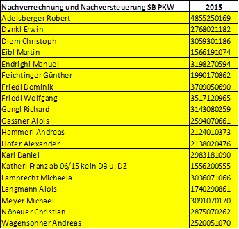 Da die Berechnung der Sachbezüge für die Monate Februar 2014 bis Dezember 2014, Februar 2015 bis Dezember 2018 auf gleiche Weise wie in den vorstehend dargestellten Tabellen erfolgte, wird aus Gründen der Übersichtlichkeit auf die Beilagen zur Schlussbesprechung 2014 bis 2018 (Excel-Dokument „0009_Beilage_zur_Schlussbesprechung_Zuordnung_KFZ_ DN_inkl_ Anschaffungskosten_CO2_Nova.xlsx“) verwiesen.