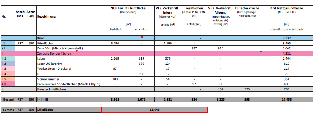 Anhang 3 (Bau- und Ausstattungsbeschreibung der Umweltbundesamt GmbH) beinhaltet 1. die allgemeinen Anforderungen (Schnittstellen zw. vermieter- und mieterseitiger Leistung; Allgemeine Anforderungen EDV), die Anforderungen Büro (je Modul; Infrastruktur; Überblick Büroanforderungen je Modul), die Anforderungen Labor (Anforderungen Logistik; Anforderungen Oberflächenbeständigkeit und Reinigbarkeit; Anforderungen Lüftung; Anforderungen Brandabschnitte; Anforderungen Gasversorgung; Anforderungen Wasseraufbereitung; Anforderungen Druckluft; Anforderungen Kühlräume) sowie die Anforderungen sonstige Sonderflächen (Werkstätten Druckerei; Bodenbeläge sonstige Sonderflächen). Gemäß Anhang 4 (Raum- und Funktionsprogramm der Umweltbundsamt GmbH) ist folgender Flächenbedarf gesamt gegeben: