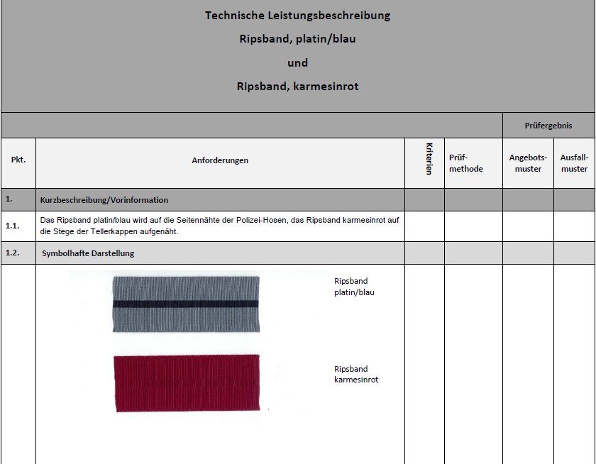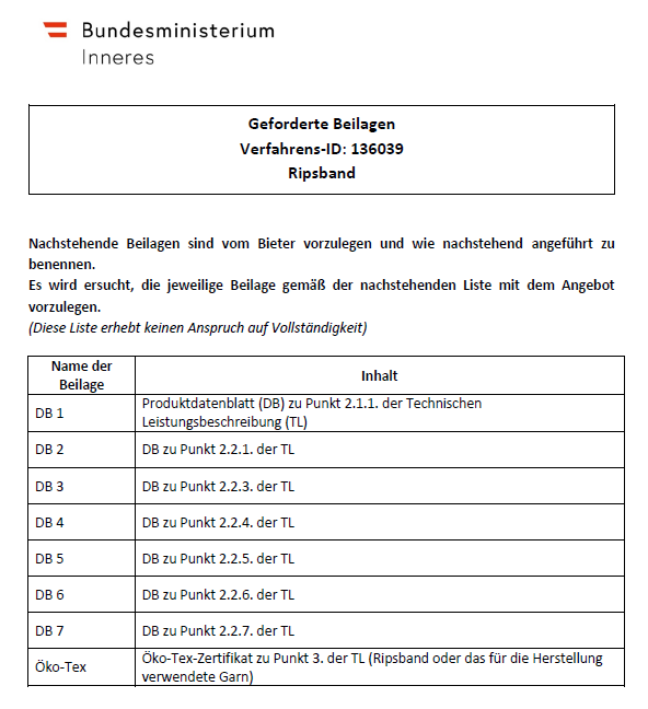 Die Auftraggeberin führe mit der Bezeichnung „Ripsband“ ein offenes Verfahren im Oberschwellenbereich zur Vergabe eines Lieferauftrags betreffend die Lieferung von Ripsbändern in zwei unterschiedlichen Ausführungen, nämlich Ripsband platin-blau für die Seitennähte der Polizeihosen sowie Ripsband karmesinrot für die Stege der Tellerkappen, nach dem Billigstbieterprinzip durch. Die Technische Leistungsbeschreibung beinhalte detailliert die Anforderung an das Angebotsmuster. Unter Punkt 4 seien die seitens des Bieters zu tätigenden Angaben zu den Prüfmethoden definiert. Neben anzuführenden Normen habe der Bieter ein Produktdatenblatt vorzulegen. Nachfolgend seien die technischen Voraussetzungen des Materials im Detail definiert. Nur bei Erfüllung dieser Voraussetzungen sei der Bieter berechtigt, am Vergabeverfahren teilzunehmen. Erfülle der Bieter diese Voraussetzungen nicht, sei er vom Vergabeverfahren auszuscheiden.