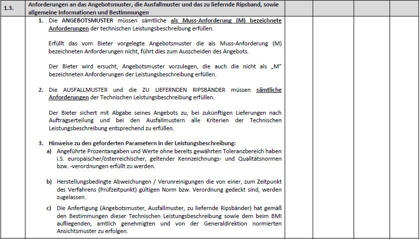 Der Einwand, wonach das Angebot der präsumtiven Zuschlagsempfängerin auszuscheiden gewesen wäre, gehe jedenfalls ins Leere. Den Bieter treffe keine Verpflichtung zur Angabe jener Normen, die bei der Angebotsprüfung relevant seien. Die Antragstellerin unterliege hier abermals einem Rechtsirrtum. Der von der Antragstellerin in der Replik angeführte Punkt 1.3., Ziffer 4 der Ausschreibungsunterlagen – Teil C – Technische Leistungsbedingungen – Technische Leistungsbeschreibung (TL) trage die Überschrift „Anforderungen an das Angebotsmuster, die Ausfallmuster und das zu liefernde Ripsband, sowie allgemeine Informationen und Bestimmungen“ – unschwer sei daraus bereits zu erkennen, dass die Ziffern 1 und 2 von Punkt Punkt 1.3 TL jedenfalls „Anforderungen an das Angebotsmuster, die Ausfallmuster und das zu liefernde Ripsband“ enthalten würden und die Ziffer 4 (mit dem Titel „Angaben zu den Prüfmethoden“) „allgemeine Informationen und Bestimmungen“ mit Informationen zu Prüfmethoden darstellen würden. Die für die Angebotsprüfung herangezogenen Normen seien in der TL in der Spalte „Prüfmethode" angeführt. Das Produktdatenblatt über das von der präsumtiven Zuschlagsempfängerin angebotene Produkt sei von dieser entgegen der Vorhalte der Antragstellerin vorgelegt worden. Die Prüfung des Angebotsmusters der präsumtiven Zuschlagsempfängerin habe ergeben, dass dieses sämtliche Muss-Anforderungen erfülle.