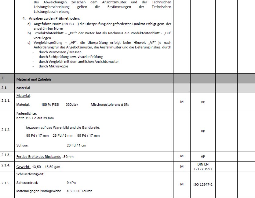 Das Ermittlungsverfahren hat ergeben, dass das dem Angebot der in Aussicht genommenen Zuschlagsempfängerin angeschlossene Datenblatt (Technical Data Sheet) des Garnherstellers keine Angaben und technischen Werte in Bezug auf zwei - nach der Prüfmethode „Produktdatenblatt“ zu prüfende - Muss-Anforderungen beinhaltet. Im Übrigen wird bei der Angabe der technischen Werte nicht nach den im jeweiligen Kriterium genannten Normen unterschieden. Die der Beurteilung zugrundeliegenden Normen werden nicht ausdrücklich bezeichnet.