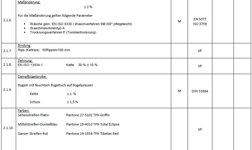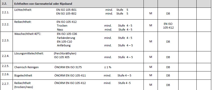 Abgesehen davon verfolgen die den einzelnen technischen Anforderungen zugrundeliegenden Normen die Beurteilung gänzlich unterschiedlicher Ein- bzw Auswirkungen auf die Eigenschaften der Textilien, wie etwa deren Maß oder Farbe. Angesichts dieser Differenzierung hat die Auftraggeberin eine klare Unterscheidung nach den aufgezeigten Kriterien unter Bezugnahme auf die jeweils maßgeblichen Normen getroffen (siehe Spalte „Anforderungen“ in der TL). Sie fordert demnach auch die Vorlage jeweils eines Datenblattes für jede einzelne technische Anforderung (Beilage 06, „Geforderte Beilagen“). Es muss daher aus den Produktdatenblättern zumindest eine eindeutige und nachvollziehbare Zuordnung der erreichten technischen Werte zu den einzelnen Muss-Kriterien sowie zu den bei diesen Kriterien jeweils bezeichneten Normen erkennbar sein. Dabei ist auch zu berücksichtigen, dass zwei Angebotsmuster, einmal in „platin-blau“ und einmal in „karmesinrot“, vorzulegen sind und dass die Werte insofern nicht notwendigerweise ident sein müssen.