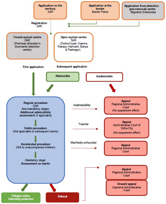 Bulgarien kennt folgende Schutzformen: Asyl (ist ein politisch durch den Präsidenten vergebener Schutztitel), internationaler Schutz (1. Flüchtlingsstatus und 2. subsidiärer Schutz) und temporärer Schutz (wird durch den Ministerrat bei außergewöhnlichen Ereignissen vergeben). 2022 gab es in Bulgarien 20.407 Asylanträge (16 % unbegleitete Minderjährige; Syrien: 8.598, Afghanistan: 7.164, Marokko: 1.721, Ukraine: 1.313, Irak: 656) und 4.373 positive Entscheidungen, 444 negative Entscheidungen, 14.474 beendete Verfahren (terminated) (SAREF 2023).