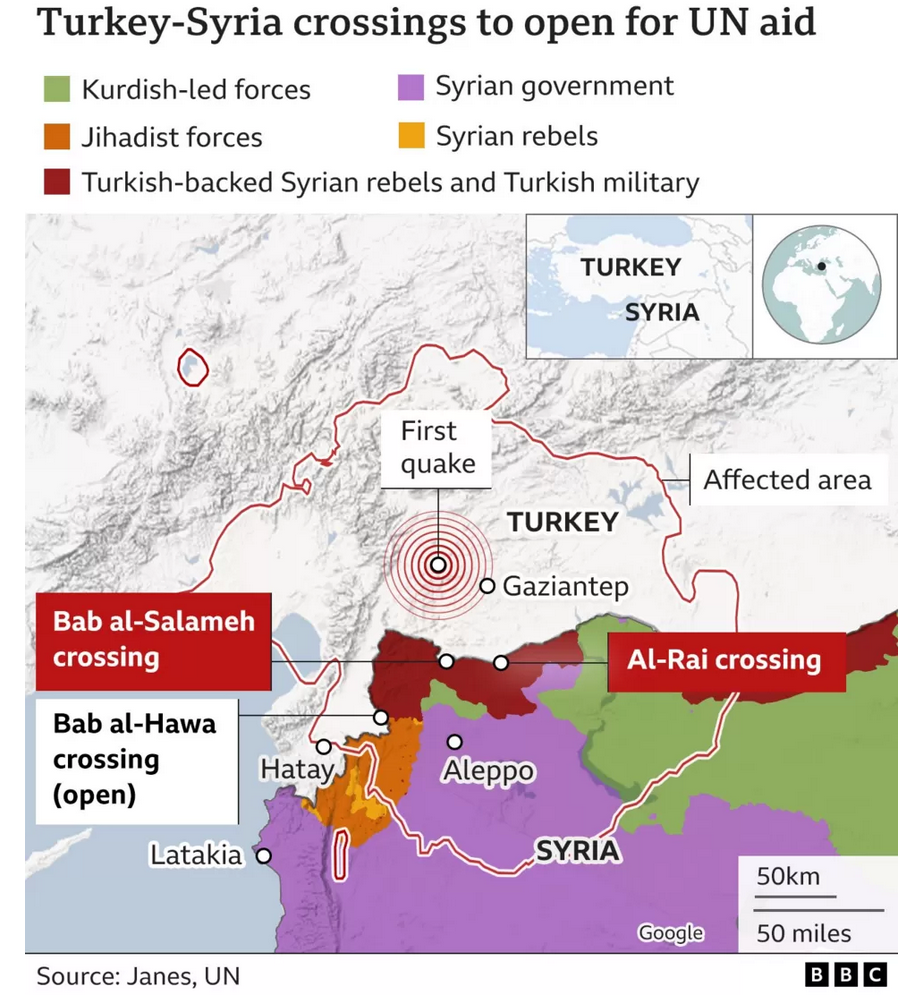 Für den BF wäre im gegenständlichen Fall insbesondere eine Einreise über den zivilen und kommerziellen Grenzübergang Bab al-Hawa möglich, der die syrische Provinz Idlib mit der türkischen Provinz Hatay verbindet und von der Allgemeinen Behörde für den Grenzübergang Bab al-Hawa (General Authority of the Bab al-Hawa Crossing) verwaltet wird, die in der Praxis der Grenzverwaltung der Syrischen Heilsregierung (Syrian Salvation Government, SSG) untersteht. Bab al-Hawa ist gemäß Resolution 2672 (09.01.2023) des Sicherheitsrats der Vereinten Nationen (UN) der einzige Grenzübergang, welcher für humanitäre Hilfslieferungen der UN verwendet werden kann. Während in der Verwaltung des Grenzübergangs Zivilisten tätig sind, wird der Grenzübergang bezüglich der Einhebung von Abgaben und Steuern eigentlich von der HTS kontrolliert. Bab al-Hawa ist der größte Grenzübergang im Nordwesten Syriens, was humanitäre Hilfsgüter wie auch Personen- und Warenverkehr betrifft und die wichtigste Einnahmequelle der HTS.