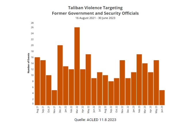 Für den Zeitraum vom 16.8.2021 - 30.5.2023 verzeichnet ACLED über 400 Gewalttaten gegen ehemalige Regierungs- und Sicherheitsbeamte, von denen 290 von den Taliban verübt wurden (siehe nachstehende Grafik). Bei vielen Angriffen, die von nicht identifizierten Angreifern verübt wurden, haben lokale Quellen oder Familien der Opfer die Taliban beschuldigt, dafür verantwortlich zu sein (ACLED 11.8.2023).