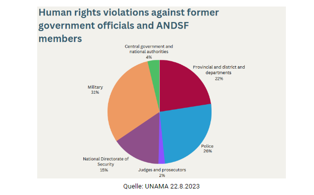 UNAMA dokumentiert für denselben Zeitraum (15.8.2021 - 30.6.2023) sogar mindestens 800 Menschrechtsverletzungen gegen ehemalige Regierungs- und Sicherheitsbeamte, darunter außergerichtliche Tötungen, gewaltsames Verschwinden, willkürliche Verhaftungen und Inhaftierungen, Folter und Misshandlungen sowie Drohungen (UNAMA 22.8.2023).