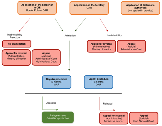 Spanien verfügt über ein rechtsstaatliches Asylsystem mit administrativen und gerichtlichen Beschwerdemöglichkeiten. In erster Instanz ist das Oficina de Asilo y Refugio (OAR) zuständig für die Bearbeitung von Asylanträgen. Es untersteht dem Innenministerium: