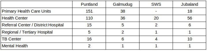 Die Gesundheitsdirektion der Benadir Regional Administration (BRA) verfügt über 69 Gesundheitszentren für die Primärversorgung, sechs Stabilisierungszentren für unterernährte Kinder und elf Zentren für die Behandlung von Tuberkulose. Zusätzlich gibt es in der Hauptstadtregion fast 80 private Gesundheitszentren. Insgesamt sind diese Zahlen zwar vielversprechend, decken aber keinesfalls die Bedürfnisse der Bevölkerung ab (SPA 31.8.2022). Nach anderen Angaben gibt es in Benadir 61 Gesundheitseinrichtungen, in HirShabelle 81. In anderen Bundesstaaten stehen folgende Gesundheitseinrichtungen zur Verfügung (HIPS 5.2020, S. 39ff):